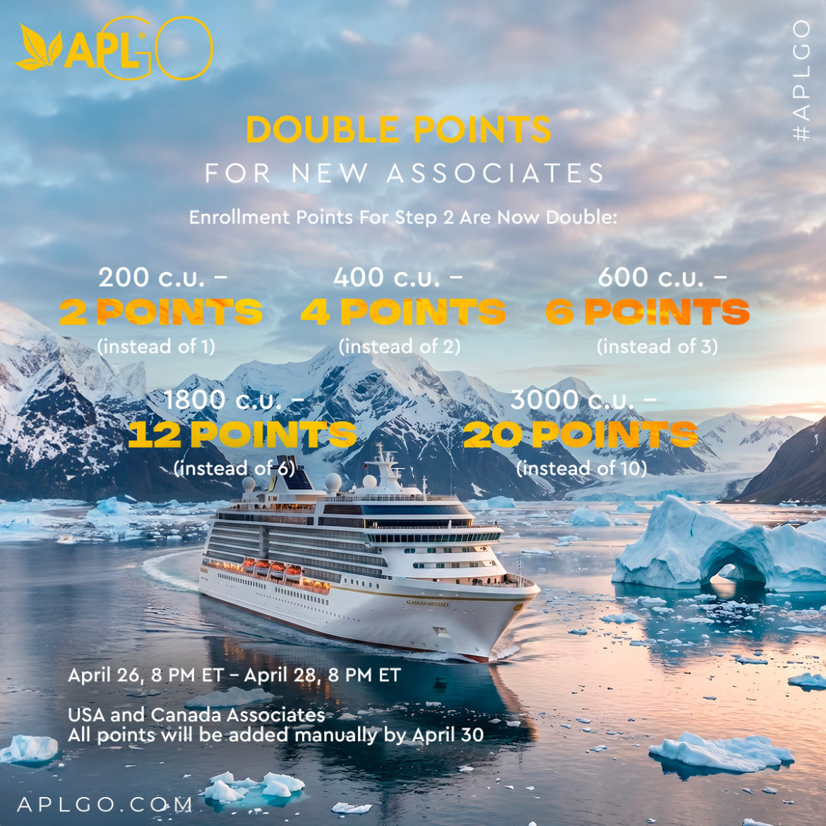 This is your last opportunity to earn the incredible Alaska Adventure cruise incentive! For a limited time, APLGO is doubling the points you earn for new Enrollments.